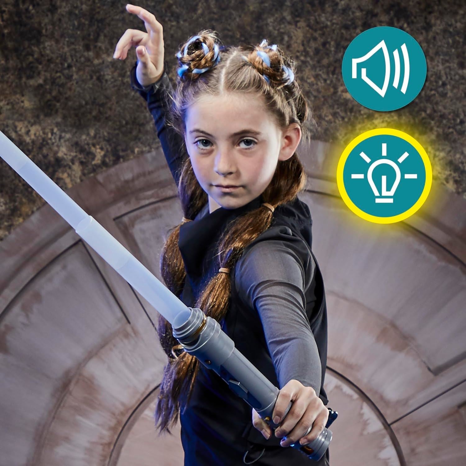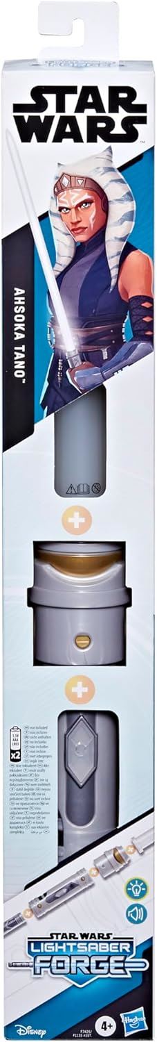 Young Star Wars fans can imagine the excitement and adventure of a galaxy far, far away with the Star Wars Lightsaber Forge Ahsoka Tano Electronic Lightsaber. This kids Lightsaber features character-inspired design, an extendable light-up white blade that flicks open, and electronic sound effects inspired by entertainment. Use the included blade, cap, cover, and core to create Ahsoka Tano's Lightsaber and imagine harnessing the power of the Force. And with pieces that are compatible across the entire Star Wars Lightsaber Forge line, kids can mix-and-match to create, customize, and master 1000s of combinations! (Total combinations includes all Lightsaber Forge products. Additional Lightsaber Forge products each sold separately. Subject to availability.) Use this Lightsaber for kids as part of a Star Wars costume, give it as a Star Wars gift for boys and girls, or add it to any fan's collection. Star Wars products are produced by Hasbro under license from Lucasfilm Ltd. Hasbro and all related terms are trademarks of Hasbro. •CHARACTER-INSPIRED DESIGN & DECO: Harness the power of the Force with the Star Wars Lightsaber Forge Ahsoka Tano Electronic Lightsaber, featuring character-inspired design and deco •CREATE THEIR OWN: This Lightsaber toy is comprised of four parts -- an extendable white blade, cap, cover, and core -- so kids can assemble their own light up Lightsaber for imaginary duels •LIGHTS & SOUND FX: Featuring lights and Lightsaber sound effects inspired by entertainment, this kids light up toy makes a great Star Wars gift for 4 year old boys and girls •CUSTOMIZABLE LIGHTSABER: Pieces are compatible across the entire Lightsaber Forge line, and the purchase of just one additional Lightsaber Forge Lightsaber unlocks 16 total combinations! (Each sold separately. Subject to availability) •MASTER 1000s OF COMBINATIONS: Use pieces across the Lightsaber Forge line to create 1000s of amazing combinations. (Total combinations includes all Lightsaber Forge products. Each sold separately. Subject to availability)