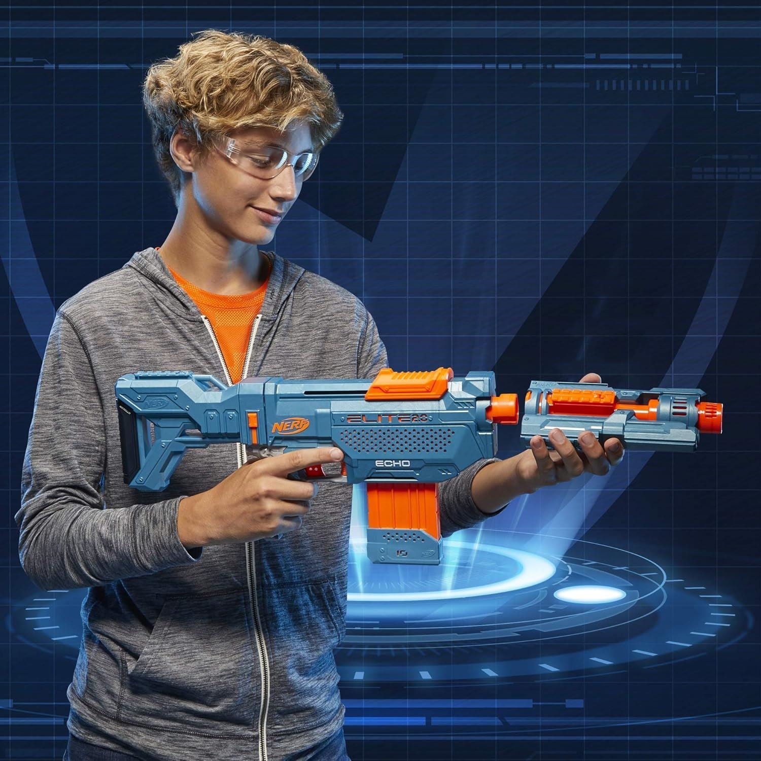 Gear up for battle with Nerf Elite 2.0 blasters that feature built-in customizing capabilities so you can upgrade them and seize the advantage in Nerf competitions. Build your stockpile of Elite 2.0 blasters to optimize your game strategy and bring tactical performance and flexibility to every mission and battle! The Nerf Elite 2.0 Echo CS-10 blaster includes a removable stock and removable barrel extension so you can customize the blaster multiple ways. Take advantage of 4 tactical rails to add other battle accessories (not included). The blaster has a 10-dart clip so you can fire a dozen darts in a row. Fire 1 dart at a time, or slam-fire all 10 darts rapidly from the pump-action blaster. Comes with 24 Official Nerf darts -- load 10 into the clip and keep the rest nearby for reloads. Fires darts up to 90 feet (27 meters). No batteries required. Eyewear recommended (not included). Nerf and all related properties are trademarks of Hasbro. UPGRADE-READY BLASTER: Customize the blaster for every battle or mission by taking advantage of the removable stock and removable barrel extension, and 4 tactical rails INCLUDES 20 NERF DARTS: Comes with 24 Official Nerf darts to fully load the 10-dart clip -- and 14 more darts for reloads SLAM FIRE: Move the priming slide backward and forward and press the trigger to fire 1 dart. Hold down the trigger and keep moving the slide to slam-fire all 10 darts fast FIRES DARTS UP TO 90 FEET (27 METERS): Go the distance with this blaster that fires darts up to 90 feet (27 meters) Includes: blaster (with removable stock, barrel extension, and 10-dart clip), 24 darts, and instructions. Ages 8 and up TO AVOID EYE INJURY: WARNING: Do not aim at eyes or face. Use of eyewear recommended for players and people within range. Use only official Nerf darts. Other darts may not meet safety standards. Do not modify darts or blaster. WARNING: CHOKING HAZARD - Small parts may be generated. Not for children under 3 years.
