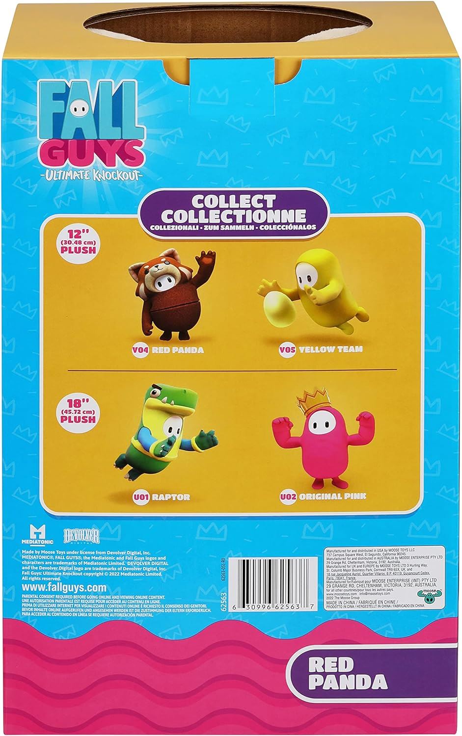 Fall Guys is the popular, massively-multiplayer party game where hordes of exceptionally clumsy beans take on bizarre obstacles and colorfully chaotic game show rounds in an epic quest for the Crown. Now you can collect all your favorite Fall Guys characters in vibrant plush form! There are 2 new medium Fall Guys characters to collect! These two adorable medium size plush are made from premium materials and capture all the fun and enthusiasm from the Fall Guys game! Created from super-soft, deluxe fabrics with detailed embroidery and stitching, both of these medium sized Fall Guys plushies stand at a big 12" tall and come with their own "Collector Style" display packaging. There are two 12" Fall Guys plush to collect - Original Yellow and Red Panda. Collect them both! Please note that there are several styles available within this assortment and unfortunately it is not possible to request which one you would prefer. If you would like to purchase a specific character, please purchase in stores. What's Inside: 1 x Plush